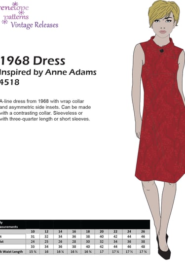 A-line dress from 1968 with wrap collar and asymmetric side insets. Can be made with a contrasting collar. Optional three-quarter length or short sleeves. Bonus front and back pieces for version with sleeves have been added.