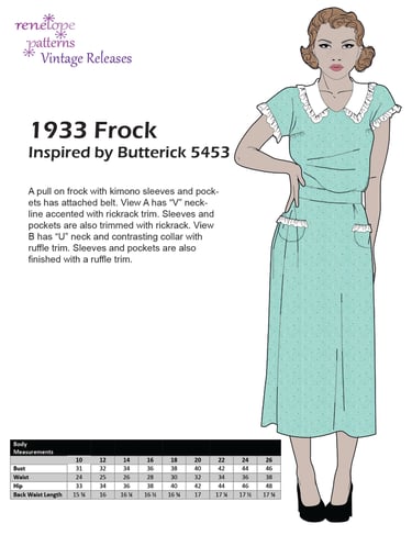 A 1933 pull-on frock with kimono sleeves and pockets is available in two views. View A has a “V” neckline accented with rickrack trim. Sleeves and pockets are also trimmed with rickrack. Attached belt ties at the back. View B has a “U” neck and contrasting collar with ruffle trim. Sleeves and pockets are also finished with a ruffle trim. The wide belt is tied in the back. Bonus pieces for each view and neck facings have been added. The pattern is constructed with modern techniques and finishing.