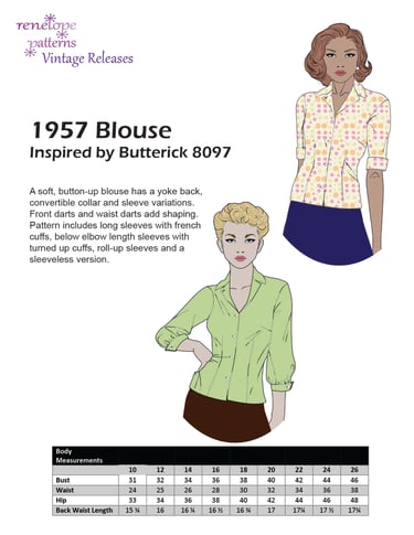 A Blouse pattern from 1957 has four sleeve variations including long sleeves with French cuffs, below the elbow sleeves with turned up cuffs, roll-up sleeves and a sleeveless version. This blouse pattern has a yoke back and convertible collar. There are French seams and waist darts for added shaping.